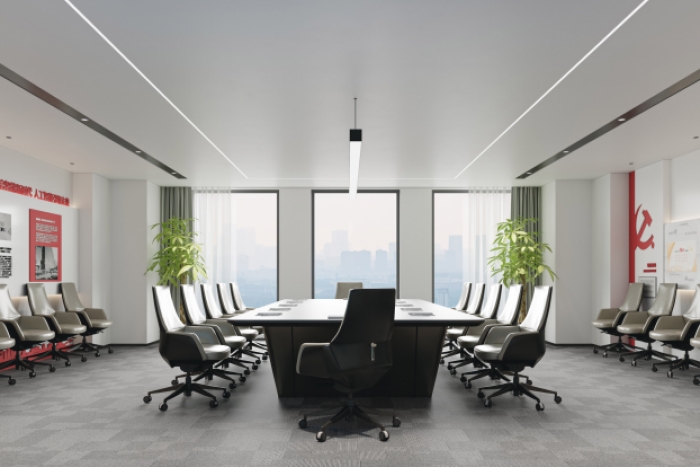 會議室采用灰色方塊地毯,全封閉雙層石膏板吊頂。