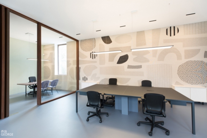 會(huì)議室色彩設(shè)計(jì)一般有主調(diào)來(lái)體現(xiàn)氣氛,主調(diào)的選擇應(yīng)能反應(yīng)空間主題并考慮色彩的施色部位及其比例分配,作為主色調(diào),一般應(yīng)占有較大比例,而次色調(diào)作為與主調(diào)相協(xié)調(diào)的用色,只占小的比例,有跳色的作用,本案中灰色為主色調(diào),加入棕色后,沉悶的空間出現(xiàn)靈動(dòng)的感覺(jué)。
